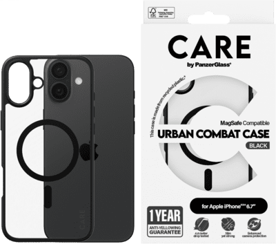 The CARE by PanzerGlass Flagship Case Urban Combat is a slim and robust protective case for smartphones. It can withstand a fall from a height of 4.8 metres and offers improved camera protection. It is also MagSafe-compatible and made from recycled plastic. The pleasant feel makes it the ideal companion for everyday use.Features Slim yet strong designDrop test from 4,8 m1-year guarantee against yellowingMagSafe-compatibleImproved camera protectionMade from recycled plasticTechnical data Compatibility Apple iPhone 16 Plus Scope of delivery Protective cover Material plastic Product type Back cover Product colour black