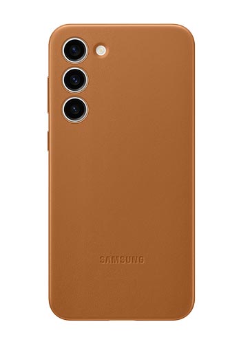 High-quality look with an elegant appearance. Made from leather, the Leather Case accentuates the slim design of your Galaxy and gives it a soft and supple cover. The Leather Case not only looks elegant and high-quality, but also offers protection against scratches and impacts ? for both the frame and the back. Material: Leather, microfibre Case type: Back cover Colour: Camel Height: 161.4 mm Length/depth: 10.9 mm Width: 79.9 mm Weight: 27 g Compatible with: Samsung S916 Galaxy S23 Plus Scope of delivery Samsung Leather Case EF-VS916