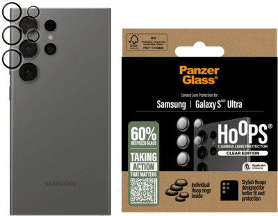 The optical rings are designed to be easy to apply and fit perfectly. They have a silicone adhesive around the edges and come with an easy-to-use applicator.Features Do not affect the clarity of your lenses or the quality of your photosMade from 60% recycled glassHigh scratch resistance, impressive impact resistance, revolutionary drop protectionminimises the risk of lens breakageTechnical specifications Manufacturer Panzerglass Compatibility Samsung Galaxy S25 Ultra Product type Protective glass for camera lenses Product colour transparent