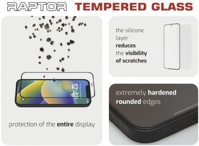 Swissten Raptor perfectly clear tempered glass from the "Case Friendly" category with hardened, rounded edges, oleophobic antibacterial coating and diamond strength. Packaged in a SWISSTEN blister pack. Maximum protection Protective tempered glass with diamond strength protects your smartphone screen from scratches and minor to medium-sized drops. The edges of the glass have extremely hardened rounded edges, which significantly increases the resistance when the smartphone falls on the edge of the display, but also extends the life of the glass itself. Design The Swissten Raptor protective tempered glass stands out for its absolute clear transparency, which does not affect the display's color rendering. Equally attractive is the ultra-thin design that does not interfere with the appearance of the smartphone. And last but not least, the optimal size of the glass from the "Case friendly" category gives the glass the possibility of combining with most cases without causing bubbles around the perimeter. Easy bonding with ESD coating ESD (Electrostatic discharge) is the best fully adhesive coating that does not attract dust from the environment. The coating makes the installation process easier and faster and also reduces the likelihood of dust and other small elements between the glass and the display. The Swissten Raptor glass package also includes a kit for easy application of the glass to your smartphone. A damp cloth to degrease and remove dirt from the smartphone display along with a dry cloth will perfectly clean the display and prepare it for easy adhesion. And stickers to remove dust particles in case they get under the bonded glass. Thanks to the Swissten Raptor ESD glass adhesive layer and cleaning kit, the glass can be glued beautifully without bubbles. In addition, the silicone adhesive layer reduces the visibility of any scratches on the used smartphone. Oleophobic and antibacterial surface The oleophobic coating with antibacterial properties will significantly reduce unwanted fingerprints on the smartphone display and can successfully destroy up to 99.9% of all bacteria.