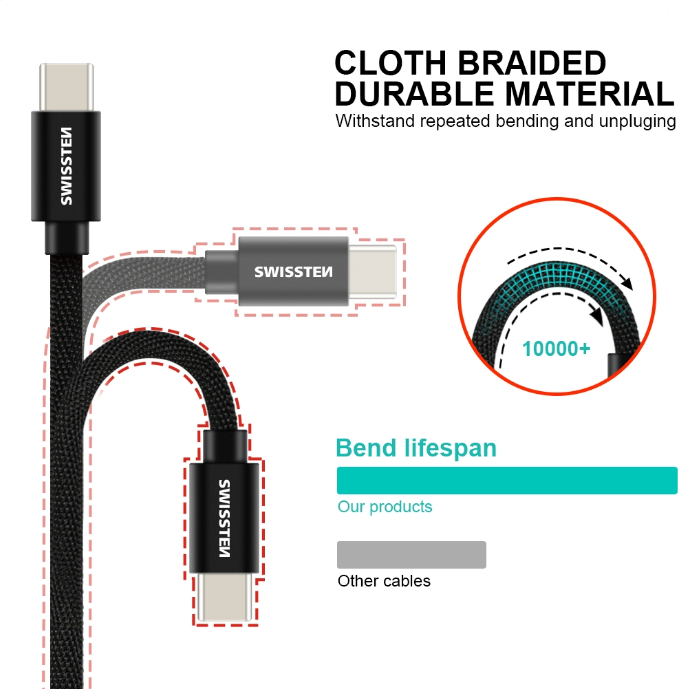Kvaliteetne tekstiilist andmekaabel USB / USB-C pikkusega 1,2 m. Kaabel on tugevdatud suurema voolu (kuni 3A) edastamiseks ja suudab toime tulla kiire 480 Mb/s andmeedastusega. Pakendatud Swissteni jaemüügipakendisse.