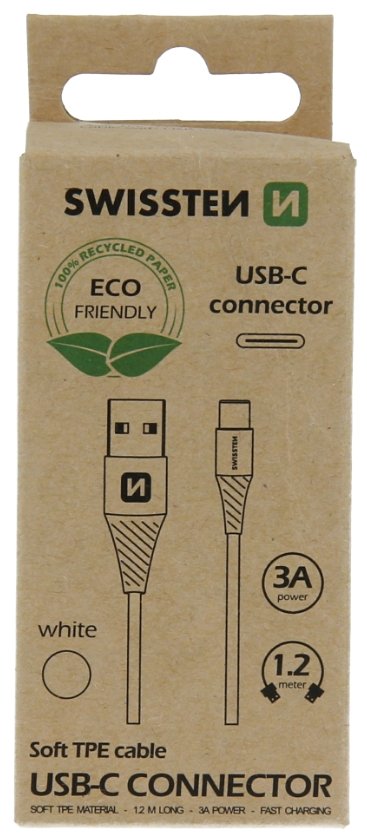Kvaliteetne TPE andmekaabel USB / USB-C pikkusega 1,2 m. Kaabel on tugevdatud suurema voolu andmiseks (kuni 3A). Pakendatud Swissten ECO jaemüügipakendisse.