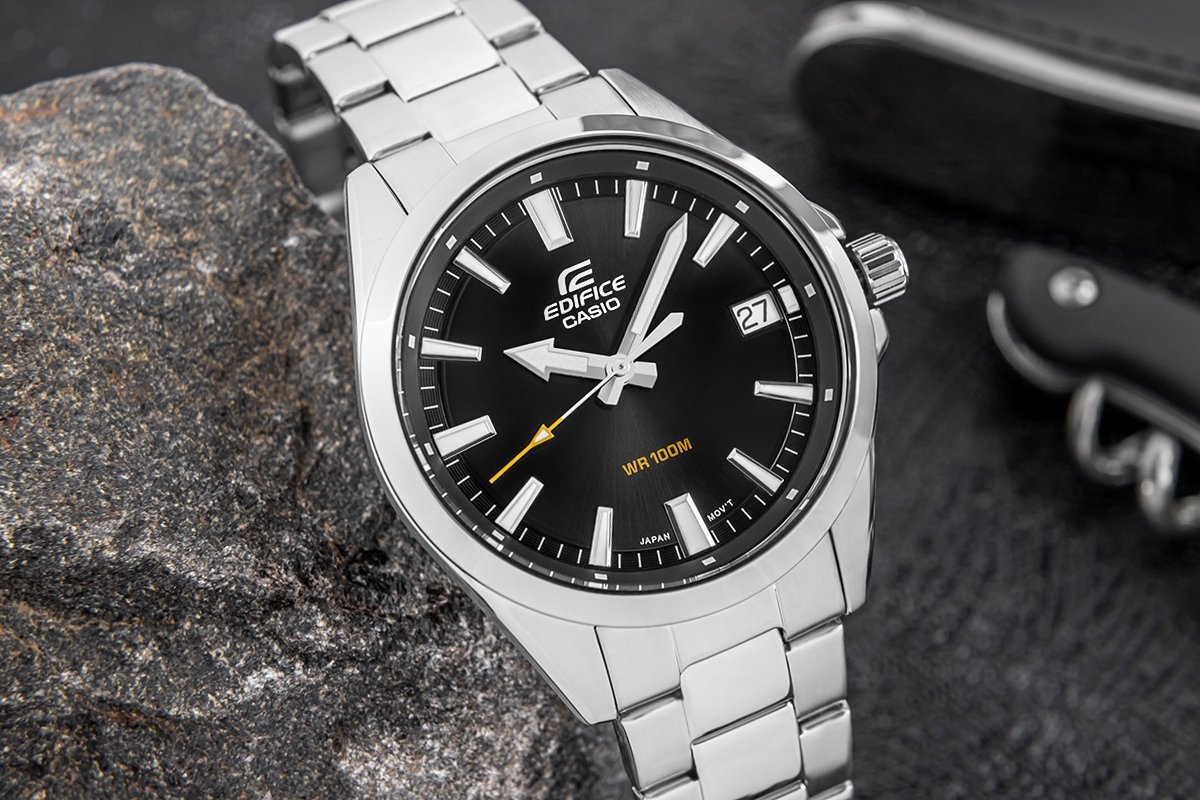Product description: • Brand: CASIO • COLLECTION: EDIFICE • Model: EFV-100D-1AVUEF • Movement: Precise Quartz with three hands: hour, minute and seconds • Dial: Analog with date function (day of month) • Case: Round stainless steel case • CRYSTAL: Mineral, scratch-resistant • Bracelet: stainless-steel bracelet with elegant finish • Luminescent hands and hour markers • WATER RESISTANCE: 10 bar – suitable for swimming • HYPOALLERGENIC: Yes – nickel-free and skin-friendly • Case: 485MM • Dial: 42MM • Case thickness: 10.9MM • Bracelet: 20MM width • Wrist circumference: 210 +/- 5 MM – adjustable for and matching Colorway: • Case: silver • Dial: black • hour markers: silver filled luminescence • Hands: silver filled luminescence • Second hand: silver/yellow • Bracelet with: silver EDIFICE. Symbiosis and technology and top precision. All models have a solid steel case, scratch-resistant Mineral glass and technologies that make EDIFICE more than just a watch.