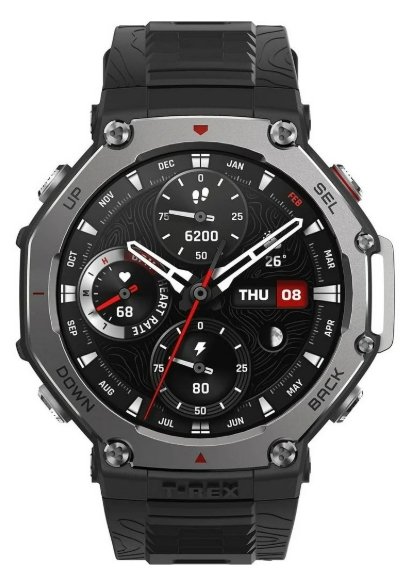 Amazfit T-Rex 3Display: 1.5" AMOLED, 480 x 480 pixelsConnectivity: Wi-Fi, GPS, Bluetooth 5.3Battery: 700 mAhOperating time: Up to 27 daysWeight: 68.3 gWater resistance: 10 ATM (up to 100 m)Strap: Silicone, black, comfortable for everyday life and sportsOperating system: Zepp OSFunctions: GPS tracking, sleep and activity monitoring, high durability