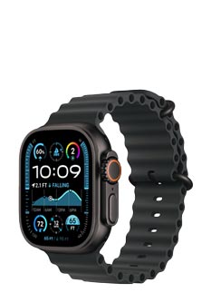 Watch Ultra 2 GPS + Cellular Maximum performance for sport and adventure The Apple Watch Ultra 2 is the ideal watch for athletes and adventurers. With its robust titanium housing and the brightest display to date (3,000 nits), it is designed for extreme conditions. It offers water resistance to 100 metres and protection against dust in accordance with IP6X. Action at your fingertips The programmable action button makes it easy to control your workouts, while the battery lasts up to 72 hours in energy-saving mode. Perfect for cyclists The Ultra 2 displays your cycling data live and can be connected to power meters so that you can view important measurements directly on your watch or iPhone. Swimming and diving adventures Whether in the pool or diving to a depth of 40 metres ? the watch tracks your activities precisely and is certified according to the EN13319 standard for diving accessories. Safely on every hike With functions such as backtrack and waypoints, you can navigate safely, even in remote areas. Offline maps and the integrated compass always get you reliably to your destination. Focus on health and safety From sleep analysis to ECG and cycle log ? the Ultra 2 provides comprehensive health monitoring. Emergency functions such as fall and accident detection offer additional safety. Always connected, worldwide With mobile communications and Apple Pay, you can always stay in touch, even without your iPhone. Features such as translations and music streaming ensure that you are well looked after when you are on the move. Compatible with: iPhone Xs or newer, including iPhone SE (2nd generation or newer), with iOS 18 or newer Colour Case: Black Titanium case, Black Ocean Band Scope of delivery: Apple Watch Ultra 2 Ocean Band Apple Watch Magnetic quick charger to USB-C cable (1 m)