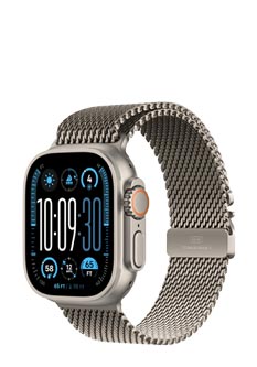 Watch Ultra 2 GPS + Cellular Maximum performance for sport and adventure The Apple Watch Ultra 2 is the ideal watch for athletes and adventurers. With its robust titanium housing and the brightest display to date (3,000 nits), it is designed for extreme conditions. It offers water resistance to 100 metres and protection against dust in accordance with IP6X. Action at your fingertips The programmable action button makes it easy to control your workouts, while the battery lasts up to 72 hours in energy-saving mode. Perfect for cyclists The Ultra 2 displays your cycling data live and can be connected to power meters so that you can view important measurements directly on your watch or iPhone. Swimming and diving adventures Whether in the pool or diving to a depth of 40 metres ? the watch tracks your activities precisely and is certified according to the EN13319 standard for diving accessories. Safely on every hike With functions such as backtrack and waypoints, you can navigate safely, even in remote areas. Offline maps and the integrated compass always get you reliably to your destination. Focus on health and safety From sleep analysis to ECG and cycle log ? the Ultra 2 provides comprehensive health monitoring. Emergency functions such as fall and accident detection offer additional safety. Always connected, worldwide With mobile communications and Apple Pay, you can always stay in touch, even without your iPhone. Features such as translations and music streaming ensure that you are well looked after when you are on the move. Compatible with: iPhone Xs or newer, including iPhone SE (2nd generation or newer), with iOS 18 or newer Colour Case: Natural Titanium case, Natural Titanium Milanese Loop Scope of delivery: Apple Watch Ultra 2 Milanese Loop M Apple Watch Magnetic quick charger to USB-C cable (1 m)
