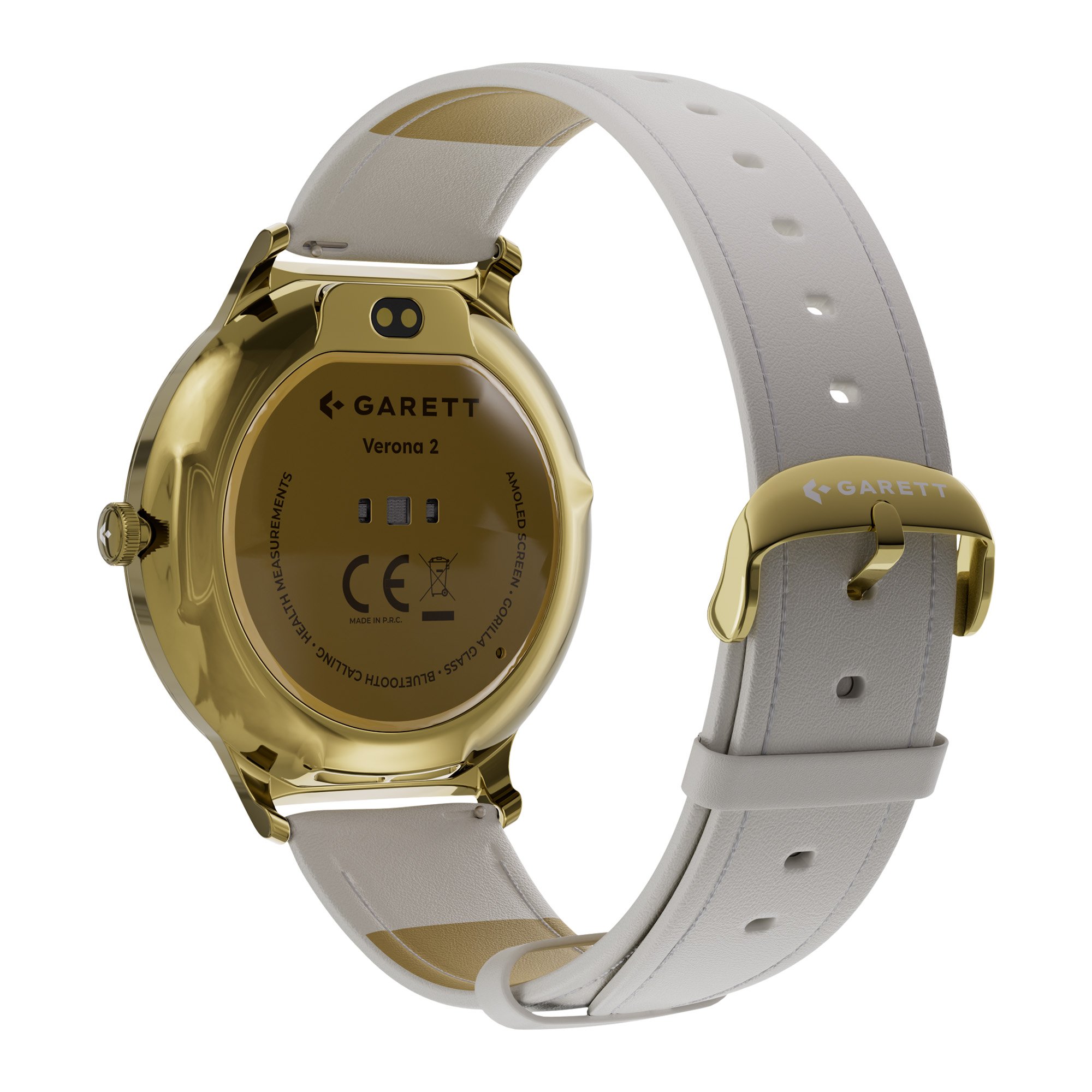 Elegance and Sophistication in Every Detail. The Garett Verona 2 Gold Solid steel is more than just a smartwatch; it's a stylish accessory that enhances your look. The thin, minimalist gold-colored case and durable stainless steel bracelet create the perfect balance between modern design and classic elegance. This watch is crafted for those who appreciate refinement and comfort. Key Features and BenefitsVivid AMOLED Display: Enjoy a bright and crisp image on the 1.3-inch AMOLED screen. The Always On Display function allows you to see the time and notifications without activating the screen, which significantly saves battery power. Long-Lasting Battery: Forget about frequent charging. The high-capacity 185 mAh battery provides up to 7 days of continuous use in standard mode and up to 14 days in standby mode. Health and Activity Tracking: The watch is equipped with all the necessary sensors to monitor your well-being. It measures heart rate, tracks sleep quality, and includes a menstrual calendar. Various sports modes will help you track steps, distance traveled, and calories burned. Stay Connected: Sync the watch with your smartphone via Bluetooth and receive notifications for calls, messages, and social media events right on your wrist, so you don't miss a thing. Comfort and Compatibility: This watch is compatible with both Android and iOS devices, making it a versatile assistant. The lightweight and thin body (just 6.8 mm) weighs around 68 g, ensuring maximum comfort during wear. Technical SpecificationsDisplay: 1.3" AMOLED Battery: 185 mAh Operating Time: Up to 7 days Memory: 64 MB Bracelet Material: Stainless steel Color: Gold Case Dimensions: 50 x 45 x 6.8 mm Weight: Approximately 68 g (with bracelet) Compatibility: Android, iOS Connectivity: Bluetooth Package Contents: Smartwatch, USB charging cable, user manual, warranty card.