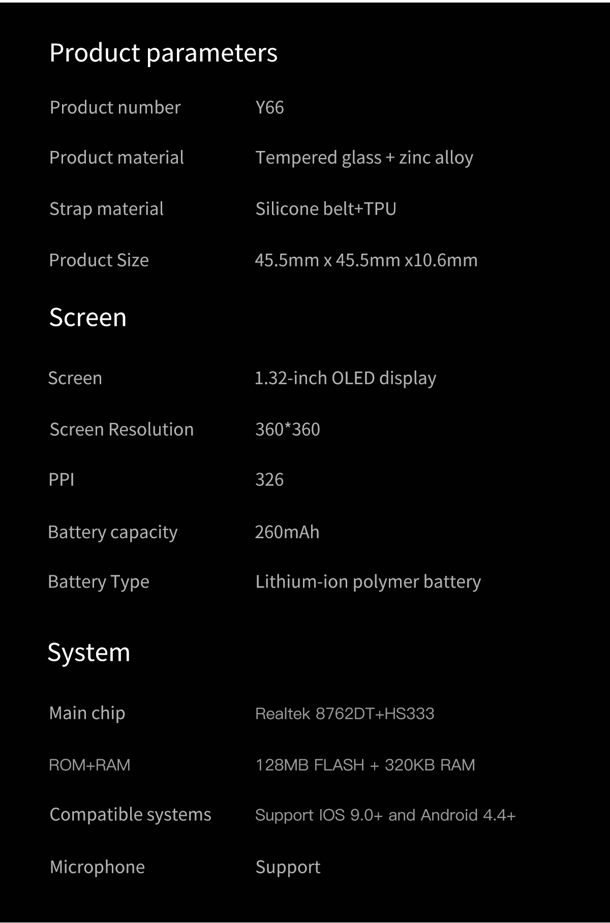 Model Number: Y66Screen Resolution: 480X320App Name: FitCludProChip: AC6954Screen Size: 1.32 inchCharging Method: Wireless chargingProduct Size: 49*44*14.4mmOperation Method: Full touch + switch button + function buttonFunction: Week, MONTH, Speed Measurement, Fitness Tracker, Calculators, Passometer, Call Reminder, Answer Call, Push Message, MessageReminder, Dial Call, Heart Rate Tracker, Gesture control, Blood oxygen monitor, NFC, Payment, The device is not a medical device.Any values shown are for reference only.