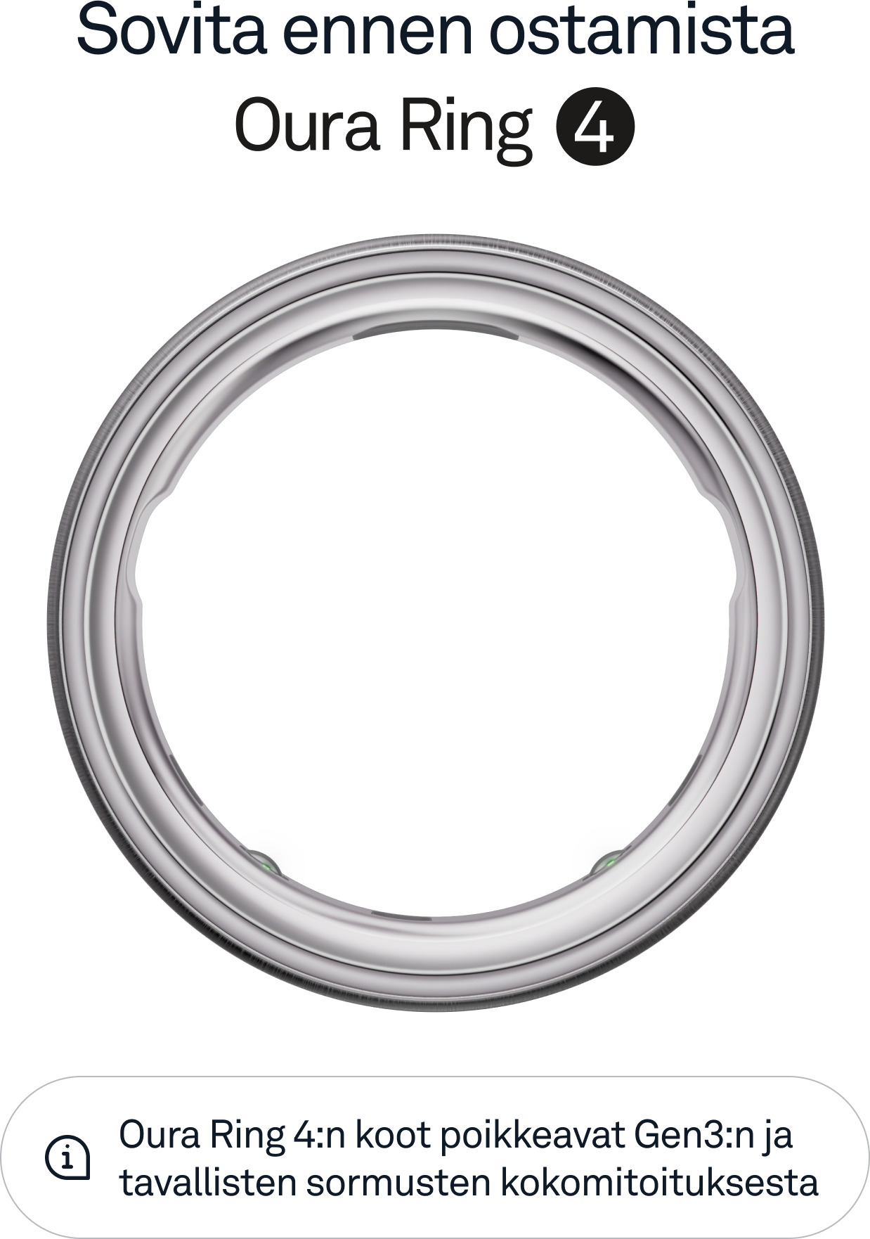 Esittelyssä Oura Ring 4 - vallankumouksellisen älysormuksen viimeisin kehitysaste. Oura Ring 4 tuo sinut lähemmäs kaikkein tärkeintä – terveyttäsi. Päivitetty ja kokonaan titaanista valmistettu malli perustuu Smart Sensing -teknologiaan. Se ei pelkästään mittaa biometriikkaasi, vaan mukautuu kehoosi ja tarjoaa tietoa yli 30 biometrisestä ominaisuudesta, kuten unesta, valmiudesta, aktiivisuudesta, sydämen terveydestä, stressistä ja naisen terveydestä. Oura Ring seuraa terveyttäsi hiljaa ja mukavasti, ja akun kesto on jopa 8 päivää – saatat jopa unohtaa sormuksen olevan sormessasi.