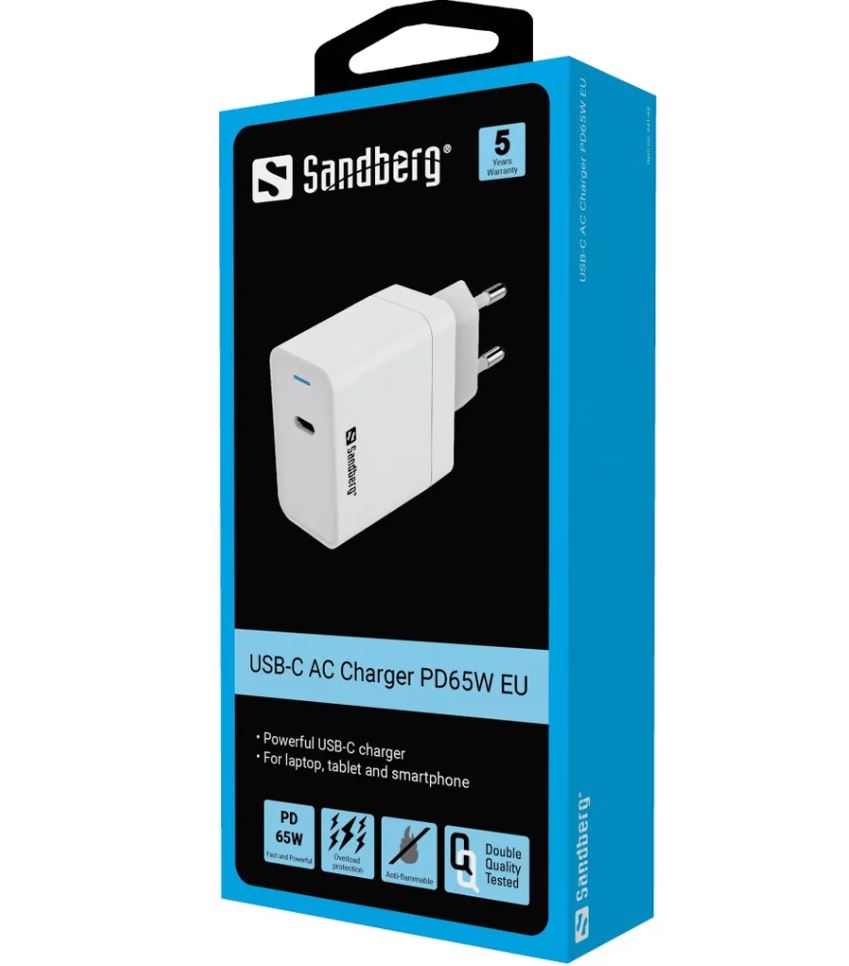 Sandberg USB-C vahelduvvoolu laadija PD65W on kompaktne USB-C PD laadija USB-C seadmete (nt nutitelefonid, tahvelarvutid ja sülearvutid) kiireks laadimiseks. Kuni 65 W jõudlusega on teil enamiku seadmete jaoks optimaalne laadimiskiirus.