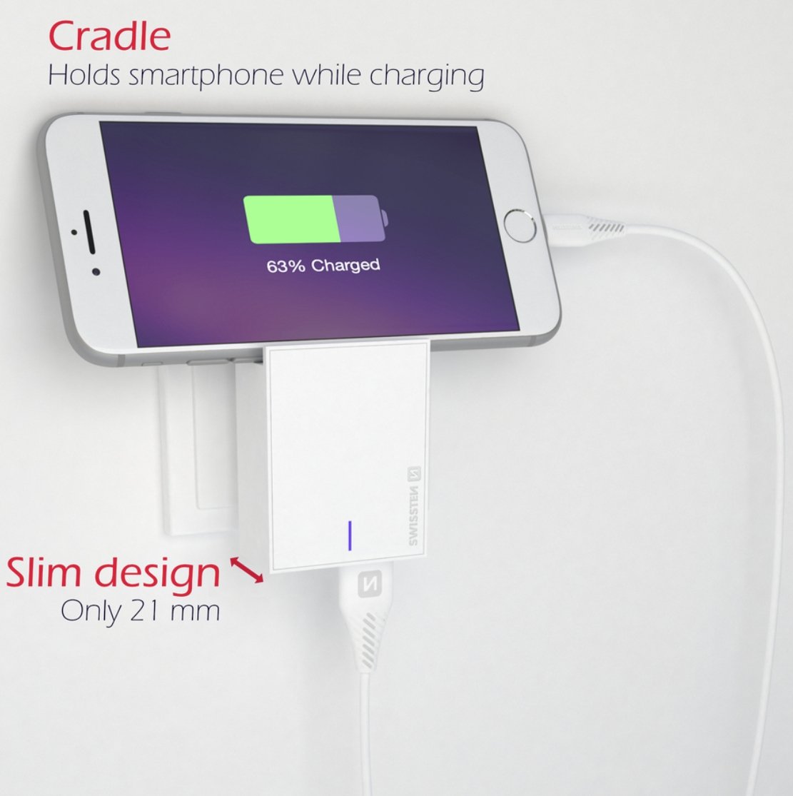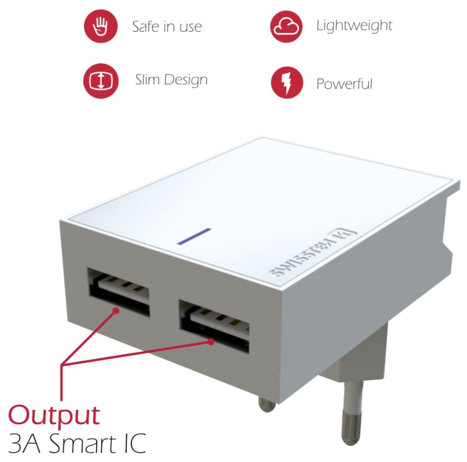 Üliõhukesel Swissten SMART IC võrguadapteril on 2 USB-porti ja koguväljundvool 3A. Nii saate hõlpsalt laadida kahte seadet korraga. Tänu SMART IC-le jaotab optimaalselt iga laadimisseadme väljundvoolu. Laadimise ajal saate laadijat kasutada mobiiltelefoni alusena. Pakend sisaldab 1,2 m USB / MICRO USB andmekaablit. Värv valge.
