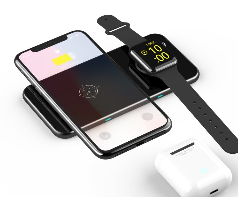 Üliõhuke juhtmevaba laadija SWISSTEN 2in1 nutitelefonide, AirPodide või Apple Watchi laadimiseks. Pakendatud SWISSTEN jaemüügipakendisse.