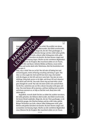 Epos 3 eBook Reader Display & Reading Comfort The Tolino Epos 3 has a generous 8-inch E-Ink Carta 1200 display with a resolution of 1440 x 1920 pixels at 300 ppi. This high-resolution display offers razor-sharp text and high contrast, which makes reading particularly pleasant. The automatic display rotation enables flexible reading in portrait and landscape format. Thanks to smartLight technology, the lighting automatically adjusts to the ambient brightness and reduces blue light for a reading experience that is easy on the eyes, even at night. Performance & memory Equipped with a powerful quad-core processor with 1.8 GHz and 1 GB RAM, the Tolino Epos 3 offers a 20% faster response time compared to its predecessor. The internal memory of 32 GB (approx. 26 GB available) enables the storage of up to 24,000 eBooks. In addition, 25 GB of cloud storage is available to synchronise your library at any time. Operation & ergonomics The eReader offers both a precise touchscreen and large scroll buttons on the edge so that you can navigate according to your preferences. The ergonomically optimised shape with a non-slip back and soft-touch surface ensures comfortable handling, even during longer reading sessions. Water resistance & mobility With IPX8 certification, the Tolino Epos 3 is waterproof and therefore ideal for use on the beach, by the pool or in the bath. The robust housing protects the eReader from water and enables carefree reading in various environments. Compatibility & connectivity The Tolino Epos 3 supports the common eBook formats EPUB and PDF, including those with Adobe DRM. Thanks to the open platform, you can obtain eBooks from various providers. The tolino cloud synchronisation allows you to access your library from different devices. Colour: Black