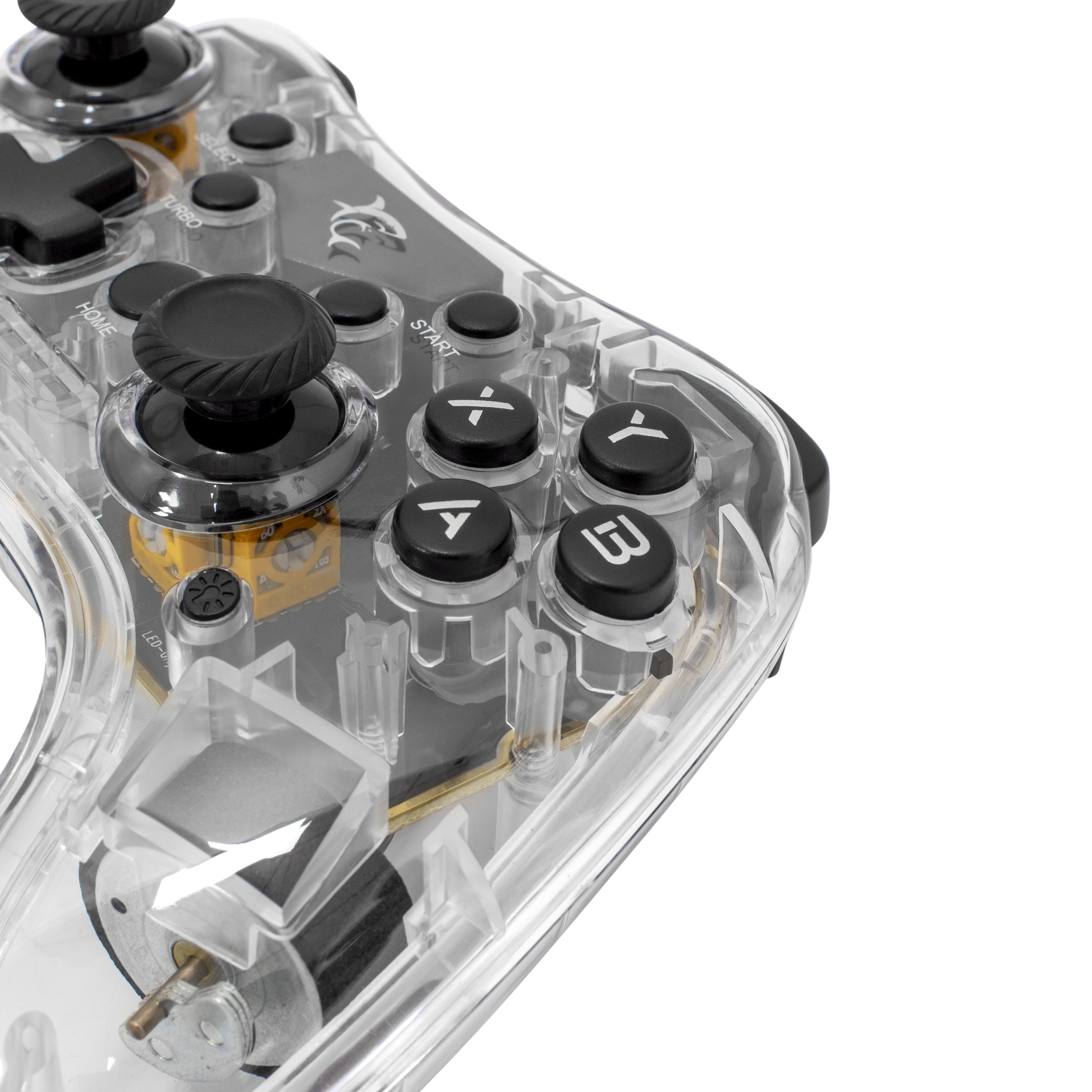 Technical data Number of keys: 19 Vibration: Yes, dual motor Interface: Bluetooth 5.0, Type-C Battery: Li-Polymer, 800 mAh Charging time (h): 2-2.5 Range (m): 8-10 Up-time (h): 5-10 Material: Plastic Cable length (m): 1 Color: Transparent casing Compatibility: Android, iOS 13.0+ (MFI), N-Switch (no sensors), Windows PC (wired), PS4/PS3 console Features: LED illumination, turbo and clear functions, support for key set function for Android with additional app Dimensions (mm): 152x115x58 Weight (g): 220