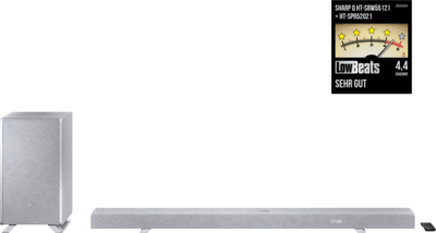With an impressive total output of 400 W, the Sharp HT-SBW55121 delivers a particularly powerful sound with deep bass - ideal for action-packed films, dynamic music or immersive gaming sessions. The wireless subwoofer ensures maximum flexibility when setting up. High-quality materials such as the metal grille front emphasise the modern design. Thanks to HDMI ARC, Bluetooth 5.0 and a wide range of audio inputs, it is technically well equipped.Features 2.1-channel system with particularly high 400 W output powerWireless subwoofer with a powerful bass foundationHDMI ARC, optical input, AUX, USB and Bluetooth 5.0Controllable via TV remote control (CEC) or supplied remote controlSound modes: film, music, speech and night modeTechnical data Connections 3.5 mm audio-in, digital optical audio inputBluetooth HDMI Manufacturer Sharp Scope of delivery Soundbar, wireless subwoofer, remote control incl. batteries, HDMI cable, wall-mounting kit. batteries, HDMI cable, wall mounting kit, power adapter, operating instructions Product type soundbar Product colour silver Other 4K UHD pass-through USB interface