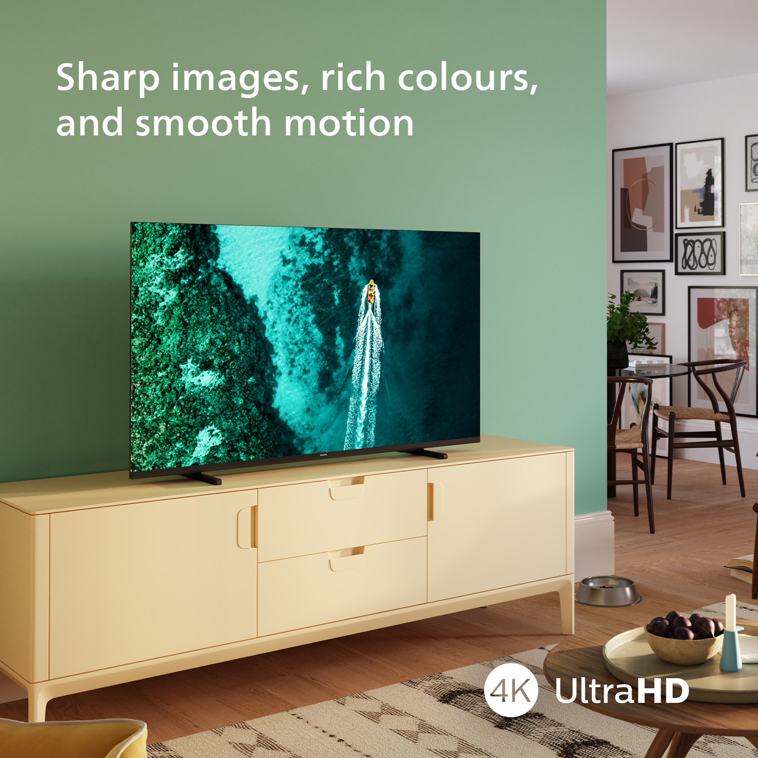 Philips PUS7409 Google TV, with the ultimate comprehensive range of apps, 60 Hz refresh rate, smart remote with voice search and Pixel Precise Ultra HD imaging. Once you've opened your favourite streaming service, it's time to enjoy the TV's ultra-sharp picture and lifelike Dolby Atmos sound.