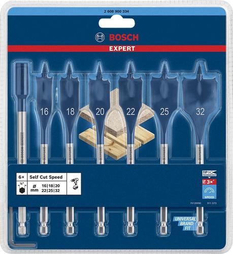 Bosch 2 608 900 334. Proper use: Drill, Drill bit type: Spade drill bit, Suitable for materials: Softwood. Package depth: 235 mm, Package width: 215 mm, Package height: 20 mm. Number of drill bits: 7 pc(s), Drill bit set included: Spade drill bit, Drill bit set sizes: 16/18/20/22/25/32 mm