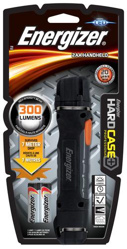 - Includes 2 Energizer® MAX® AA batteriesEnergizer Hardcase Professional. Flashlight type: Hand flashlight, Product colour: Black, Grey, Orange. Shockproof up to: 7 m, International Protection (IP) code: IPX4. Lamp type: LED, Lamps quantity: 1 lamp(s), Light output (min): 45 lm. Battery type: AA, Battery life: 6.3 h, Battery life (max): 65 h. Width: 169 mm, Depth: 40 mm, Weight: 101 g