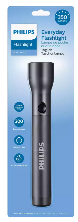 Philips SFL4003T / 10. Lamp type: submersible lamp, colour of Product: Black. International Protection (IP) code: IPX4. Lamp type: LED. Battery type: AA, battery technology: alkaline battery. Package width: 120 mm, package depth: 50 mm, package height: 380 mm