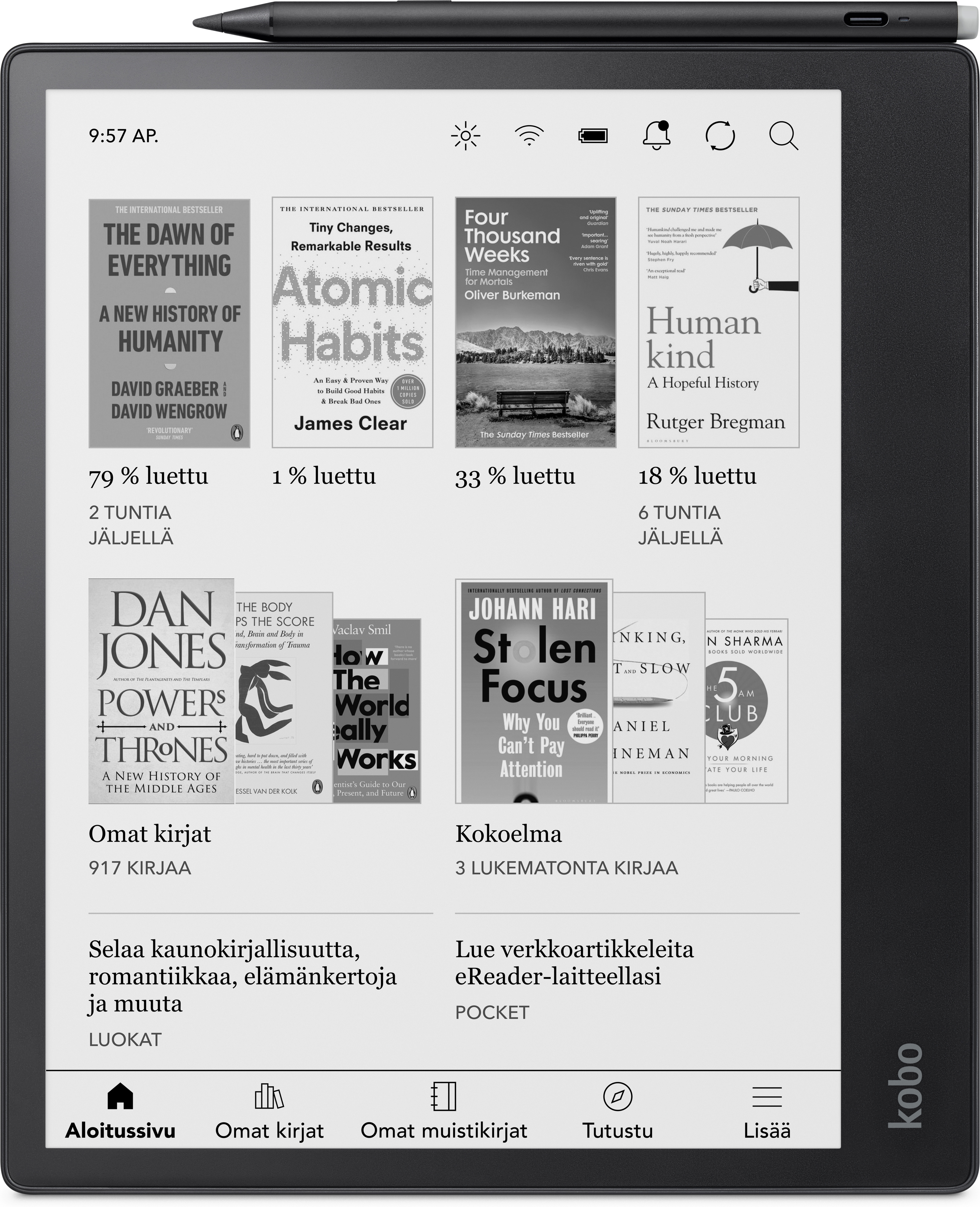 Löydä uusia maailmoja ja sukella loputtomiin seikkailuihin kanssamme tarjoamiemme e-kirjojen ja lisävarusteiden avulla. Kätevät, kevyet ja kompaktit ne mahdollistavat koko lempikirjastonne kuljettamisen mukana. Upota itsesi tiedon ja mielikuvituksen maailmaan korkean teknologian e-kirjojemme avulla.
