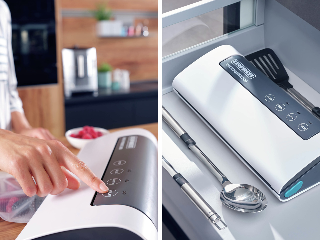 LEIFHEIT Vacu Power 300 vacuum device +(10gb vacuum bags 20*30cm)- fully automatic, electric vacuum device for vacuuming food products.Vacuum keeps food fresh up to 8x longer. 30 cm long heat bonding strip.Ideal for fish, meat, vegetables and fruit. Food retains vitamins and minerals longer in the vacuum. Speeds up the marinating process. Soft berries and fruit can be vacuumed using the vacuum stop button.Power: 120W; 9L/minSize: 36.5 x 17.00 x 9.00 cmPackage size: 37.00 x 21.5 x 10cm*Colour of the product may vary from the picture. Product description is general and does not necessarily cover all product features. Product prices in the e-shop may differ from prices in supermarkets and service centres.