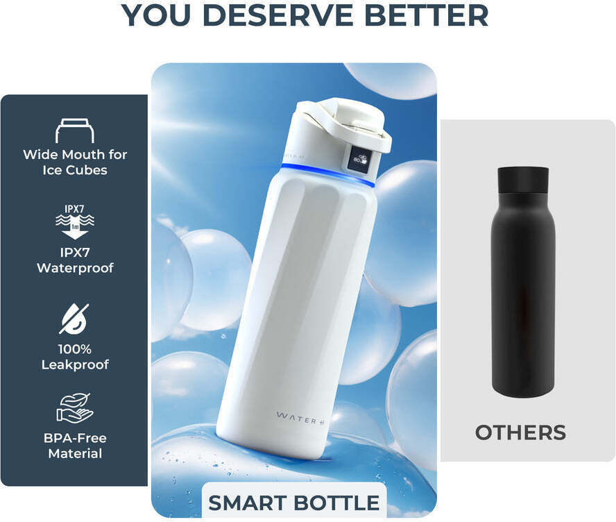 - Compatibility: WaterH app (iOS, Android), Apple Health, Apple Watch and FitBit