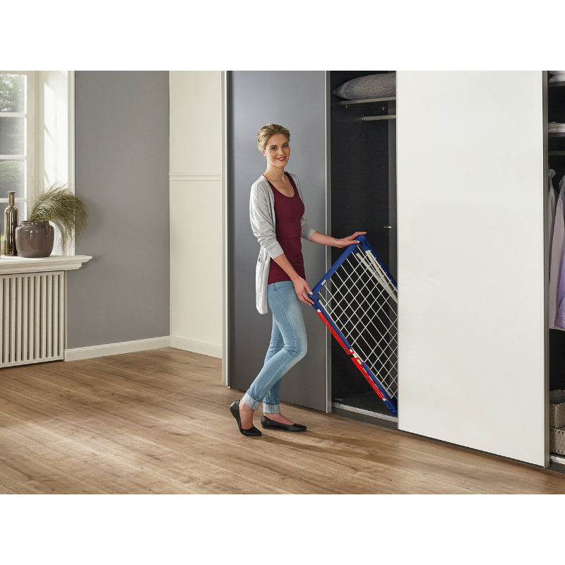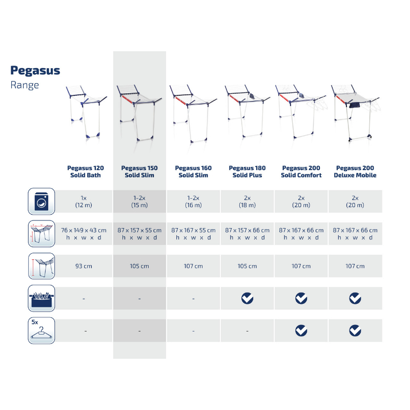 Compact and impressively powerful: with a width of only 55 centimetres, the dryer is perfect for small households.Sturdy and robust dryer made of stainless material.Although it takes up very little space, the Leifheit dryer has a total hanging length of 15 metres, which allows you to hang out your laundry from 2 washes. Thanks to the 105 cm high wings, the model is suitable for long pieces of laundry such as trousers or towels. The Pegasus 150 Solid Slim is even more convenient thanks to two holders for drying small garments such as socks or underwear.The dryer is only 55 cm narrow, making it easy to move through bathroom or balcony doors. With just a few fingers, it can be easily and quickly set up and assembled, and it takes up very little space for storage, saving space.15 m hanging length105 cm high wings allow even long pieces of laundry to dry2 small cloth holders3 year warrantyWidth 55 cmSize: 87x157x55cm Maximum height: 105cm