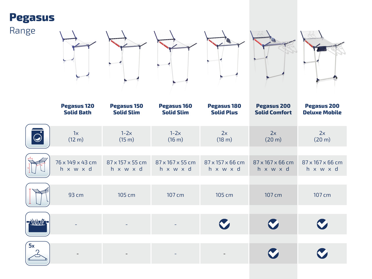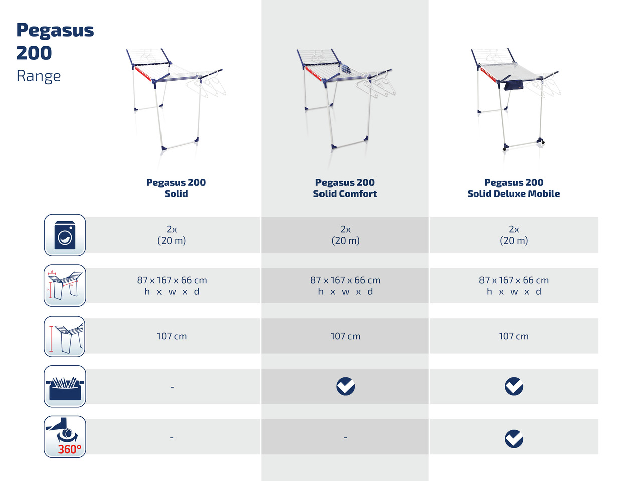 Leifheit Pegasus 200 SolidThe Leifheit Pegasus 200 Solid is a sturdy, roomy, practical helper for drying laundry in the apartment and in the garden. Its stability is ensured by the trapezoidal legs, which allow you to dry laundry outdoors even in strong winds.The clothesline has a total length of 20m, which ensures that you can dry the contents of up to two washing machines on this dryer.Five clothes hangers (shoulders) are included. You can hang blouses and shirts on them comfortably, and the hangers themselves can be placed on the tumble dryer's specially designed wavy cord. The cord is designed to be wavy so that the hangers on top of it do not slide on top of each other in the wind.Also included in the set are two small clothes holders, suitable for socks, for example, or other small items of clothing. They are a perfect replacement for the knapsacks. You will no longer have to spend time individually hanging each small item of clothing.And to keep your pegs in one place at all times, the tumble dryer comes with a peg bag (with clip). The folding wings of the tumble dryer are 107cm high, which means you can hang long garments, such as full-length trousers, on them.The tumble dryer is easy to fold, so you can store it in your apartment, on your balcony or outdoors.Warranty - 5 yearsSize: 87 x 167 x 66cm / H-107cm