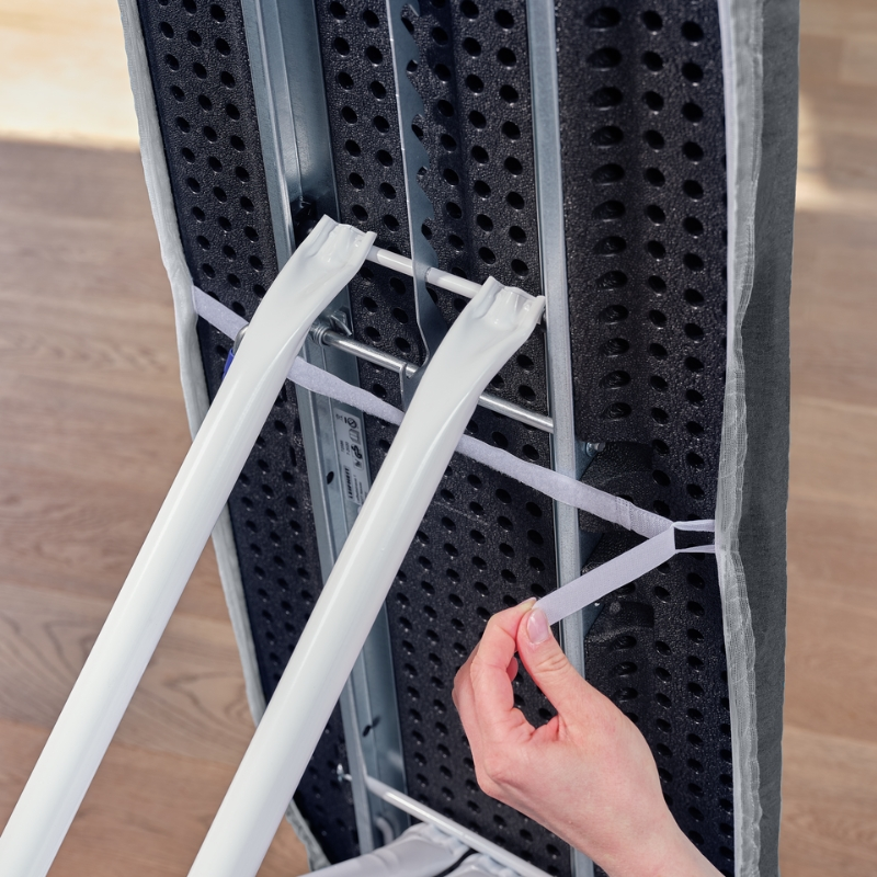 Designed for Leifheit Air Board.Cover: 29% Cotton, 8% Polyurethane, 55% Polyester, 8% Titanium, with 4 mm thick padding.Thermo-Reflect: Cover with a unique thermo-reflective surface that reflects heat and steam. This in turn reduces ironing time by up to 33%.The fabric is secured by pulling the cord together and securing with a clamp.Size: 125 x 40cm