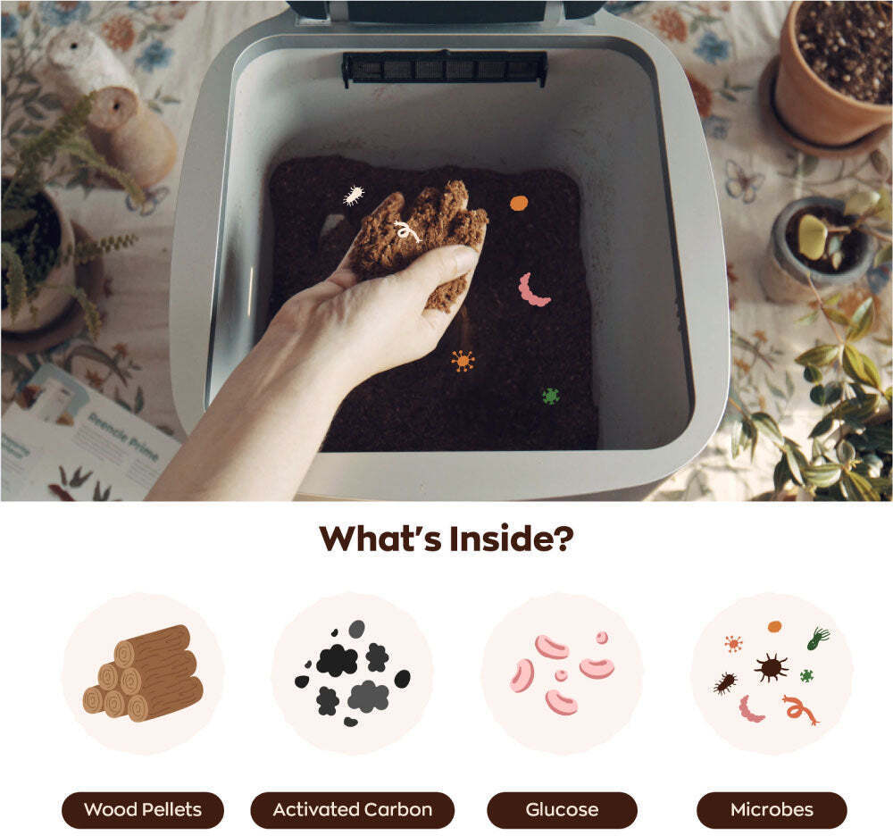 - Contains specially selected microorganisms that eat food waste, even salty and acidic ones