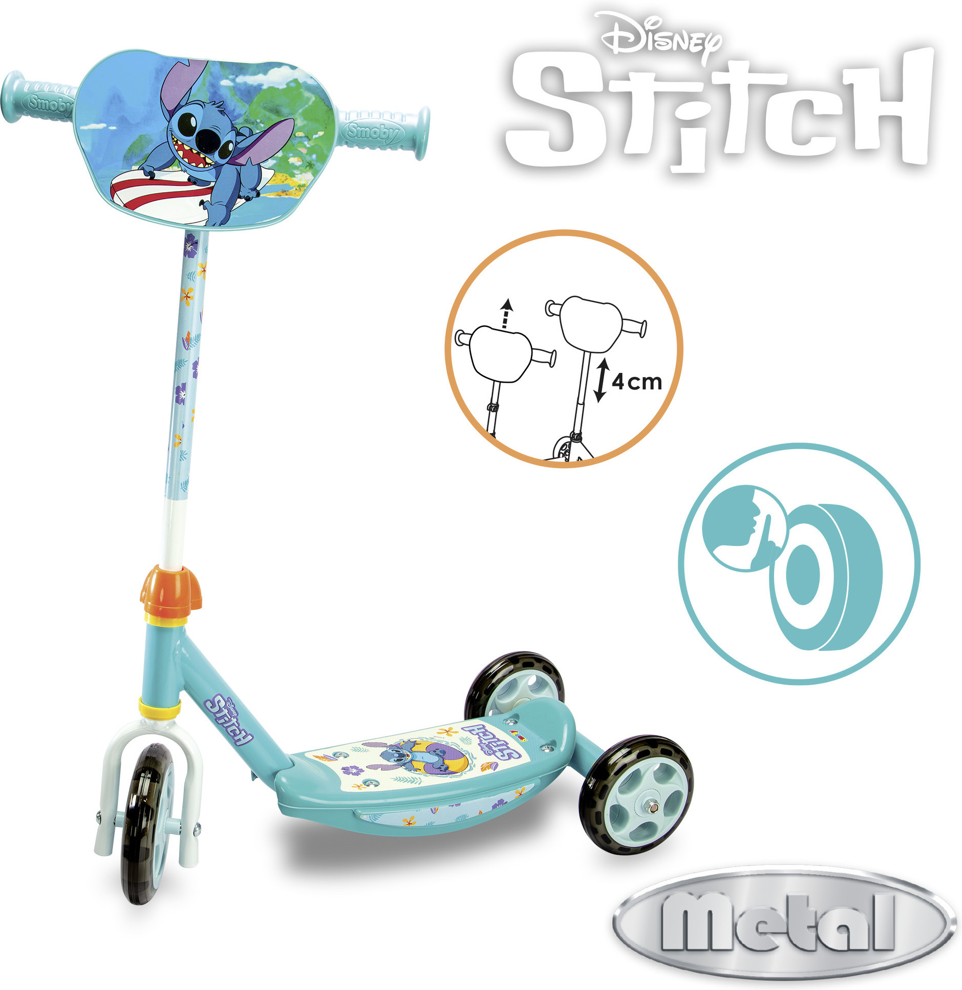 The fun Stitch pattern on the Smoby three-wheeled kickboard will delight your little kicker. The height of the handlebars can be adjusted for the most comfortable riding experience. The metal frame adds stability during the ride, while the quietly rolling wheels ensure a smooth and even ride. The wide footboard and non-slip footrest provide good grip, while the padded handles make steering comfortable.