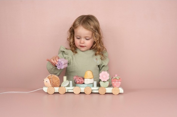 Tuut! Tuut! Kerää ja pinoa kaikki palikat tähän söpöön puiseen siilijunaan. Mukana seikkailevat siili ja leppäkerttu kukkien ja muiden hahmojen kanssa. Juna sisältää 15 osaa ja on noin 45cm pitkä. FSC-puuta.