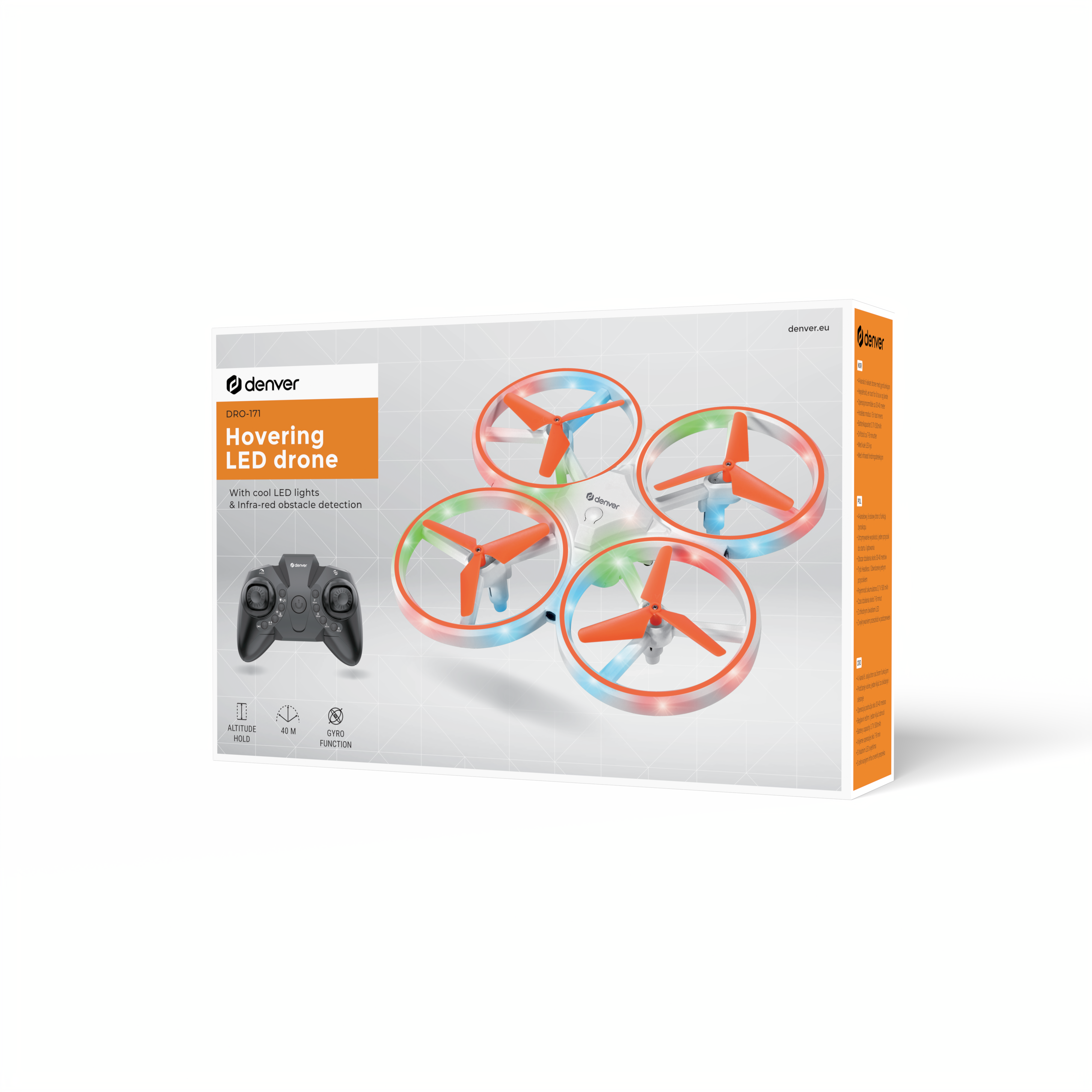 Stable & Easy to Fly 4-channel, 6-axis gyro with altitude hold for steady flight. One-key takeoff/landing, headless mode, and reverse for simple control. Smart Features LED lights for night flights and infrared sensors for obstacle detection. Good Range & Battery Life 30-40m range, 500mAh battery charges in 40 mins for 7-8 mins of flight. User-Friendly Control 2.4GHz controller (3x AA batteries required, not included).