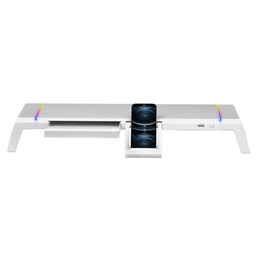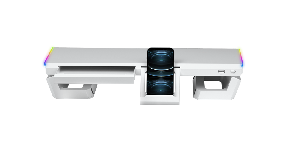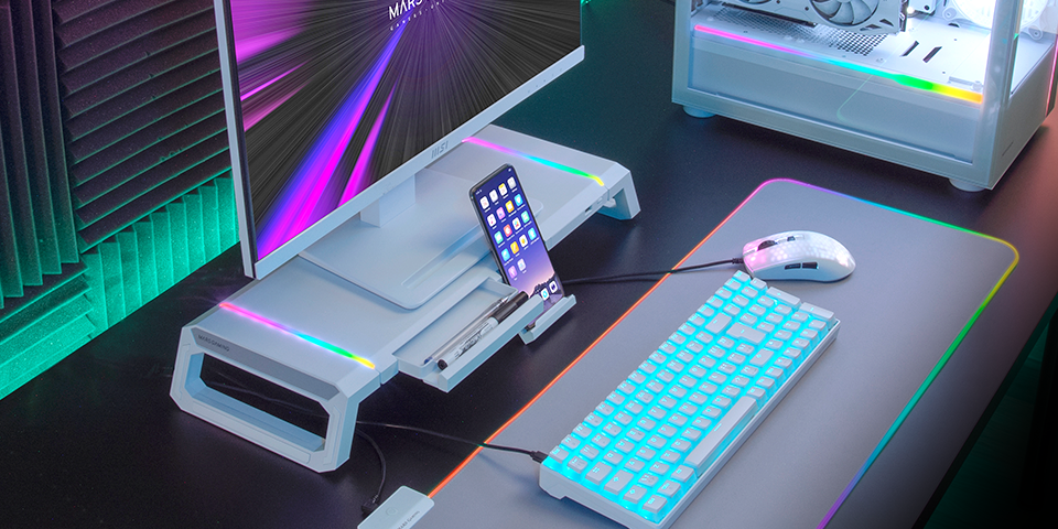 Mars Gaming MGS-ONE RGB Chroma USB Monitor Stand with Adjustable Length and Phone Holder.- CHROMA RGB lighting.- USB 2.0 port on the front panel.- mobile phone/tablet holder.- 3 size adjustment options thanks to folding edges. - CHROMA RGB LIGHTINGEnhance the look of your rig with CHROMA RGB lighting and 10 advanced lighting modes. - ADJUSTABLE SIZECustomize the MGS-ONE monitor stand to your needs with folding sides. - MAXIMUM ERGONOMICSStore the keyboard and mouse under the stand to free up desk space, while keeping the monitor at eye level for perfect ergonomics. Specifications: Dimensions: 410 mm - 475 mm - 545 x 200 x 75 mmWeight: 1520 gMaterials: ABSLighting: RGB Chroma 10 lighting effectsMaximum supported weight: 20 kg (legs extended) - 30 kg (legs folded)Connector: USB 2.0 (input) - 1x USB 2.0 (output)