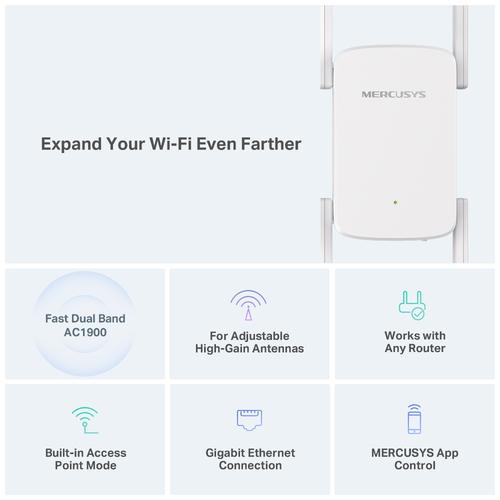 Mercusys AC1900 Wi-Fi Range Extender. Type: Network repeater, Data transfer rate: 1000 Mbit/s, Ethernet LAN data rates: 10,100,1000 Mbit/s. Cabling technology: 10/100/1000Base-T(X), Networking standards: IEEE 802.11a, IEEE 802.11ac, IEEE 802.11b, IEEE 802.11g, IEEE 802.11n, Wi-Fi standards: 802.11a, 802.11b, 802.11g, Wi-Fi 4 (802.11n), Wi-Fi 5 (802.11ac). Product colour: White. Power consumption (typical): 12 W. Width: 84.7 mm, Depth: 76.3 mm, Height: 112 mm