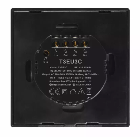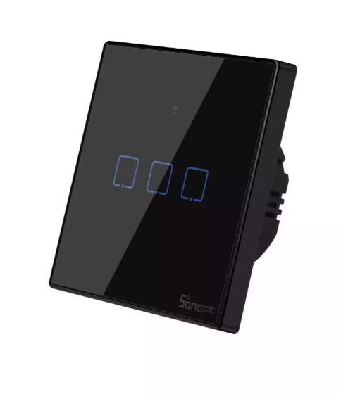 Sonoff T3 is a series of smart touch Wi-Fi switches for controlling lighting and other home devices. It supports operation via the eWeLink mobile app, voice control with Amazon Alexa and Google Assistant, and allows creating schedules and automation scenes. The touch panel is made of tempered glass and comes in 1, 2, or 3 gang variants. Technical Specifications: Model: T3 Type: touch Wi-Fi switch Connectivity: Wi-Fi 2.4 GHz, RF 433 MHz Voice Control: Amazon Alexa, Google Assistant App Control: eWeLink Housing Material: tempered glass Color: black Power Supply: AC 100–240 V, 50/60 Hz Maximum Load: 1 gang — 2 A / 480 W; 2 gang — 2 A / 480 W per gang, 4 A / 960 W total; 3 gang — 1 A / 240 W per gang, 3 A / 720 W total