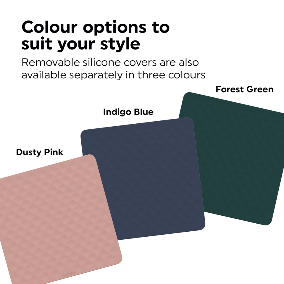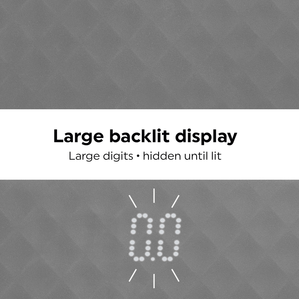 Anti-slip textured silicone platform Step on for instant weight reading White hidden till lit LED display Covers are easy to clean and dishwasher safe Batteries included