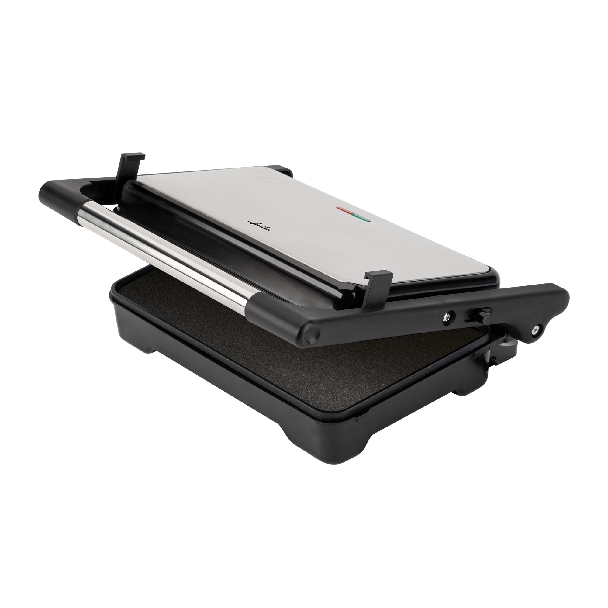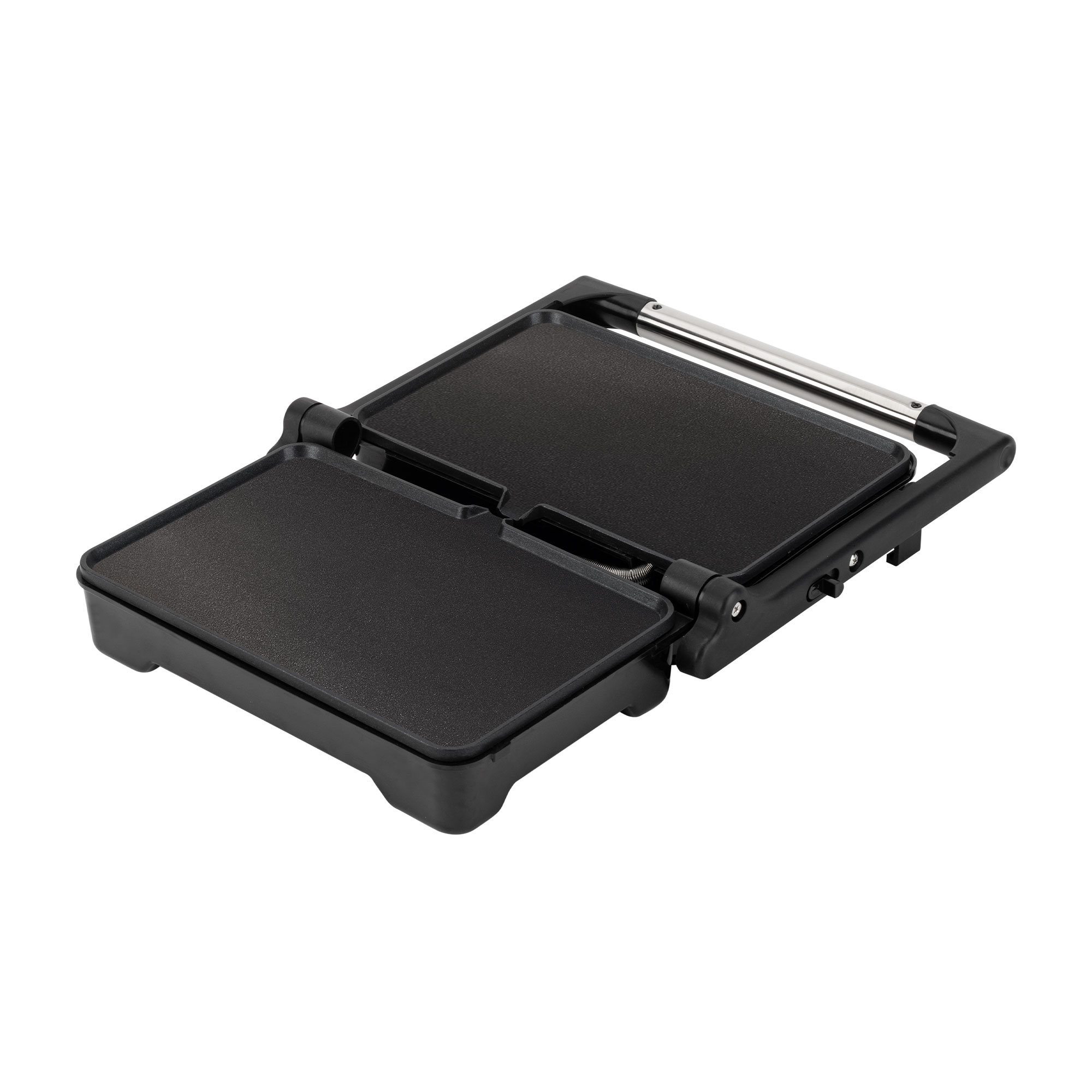2 Plates: 26 x 16.5 cm. Tilting top plate. Uniform roasting pressure. PFOA-free non-stick coating. Total opening of 180º. Cool touch opening handle. Grease tray. 2 independent light indicators: on / ready. Vertical storage. Locking knob / opening legs. Non-slip base. Overheating protection. Voltage 230 V. Power 1500 W.