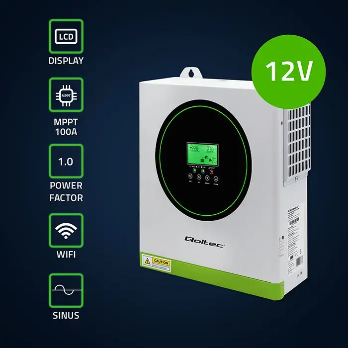 Qoltec Hibridinis Saulės Inverteris Off-Grid 1500W | 100A | 12V | MPPT | Sinusinė forma | Wi-Fi pasirenkamas | Galios koeficientas 1.0 (5901878538631)