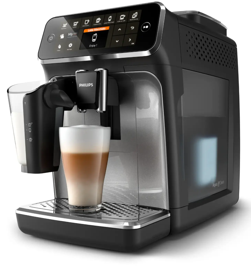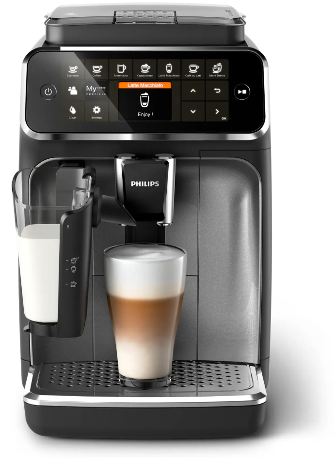 Philips EP4346/71 yra automatinė kofeininė mašina su LatteGo pieno putojimo sistema, skirta ruošti 8 rūšių gėrimus, įskaitant espresso, cappuccino ir latte macchiato, su keraminiu malūnėliu ir valdymu lietimo ekranu.