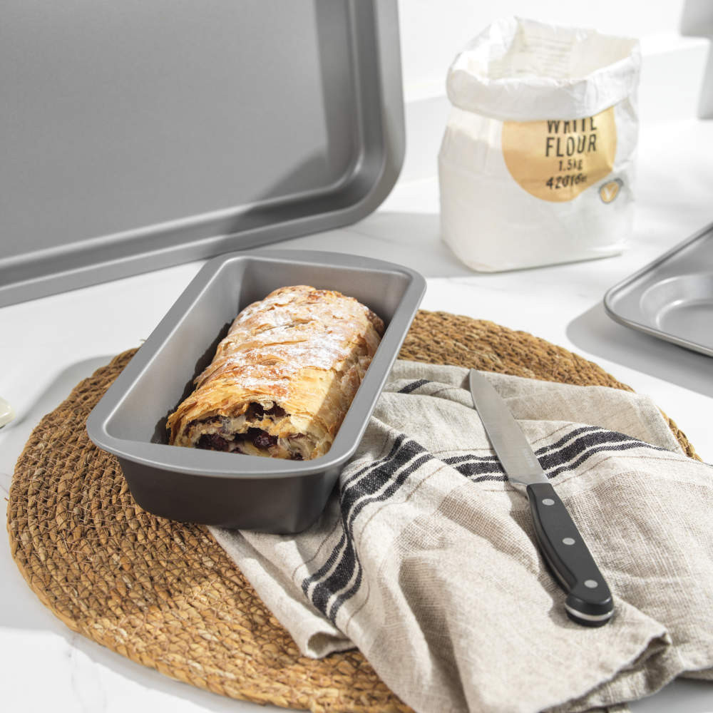 25 CM LOAF TIN: Discover the perfect baking companion with the Salter Essentials 25 cm Loaf Tin. Perfect for baking fresh bread and delicious fruit loaves, you can explore a wide range of sweet and savoury recipes. NON-STICK COATING: Keep hassle to a minimum with the non-stick coating, ensuring bakes can be easily removed from the tin without sticking. With a PFOA-free coating, you can rest assured no harmful chemicals will be released into your foods. EASY TO CLEAN: Cleaning has never been easier! You can simply wash this loaf pan in the dishwasher or clean by hand using warm water and a mild detergent. CARBON STEEL: Crafted from lightweight but durable carbon steel, this baking pan ensures quick and even heat distribution to ensure your bakes are thoroughly cooked all the way through! SALTER ESSENTIALS: Designed and made in the UK, the Salter Essentials collection offers everything you need for everyday cooking. Specification Colour: Silver/Grey Type: Loaf Tin Dishwasher Safe: Yes Non Stick Coating: Yes Material: Carbon Steel Size: 6x12.5x25cm Range: ESSENTIALS