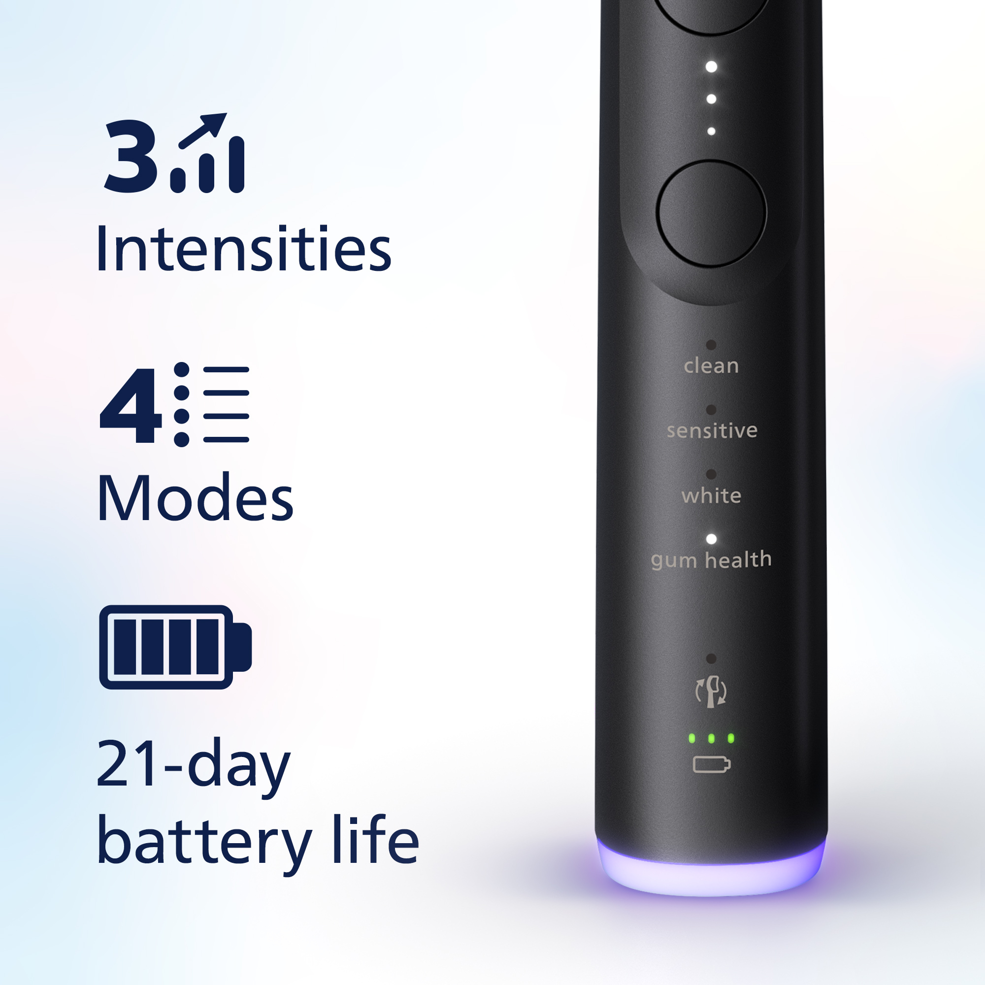 - Perfect for sensitive teeth and gums. Choose from 12 settings: 4 brushing modes (Clean, Sensitive, White or Gum Health) and 3 power settings (Low (sensitive), Medium, High).