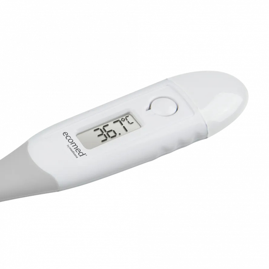 The TM-60E thermometer from Ecomed by Medisana offers a reliable and fast way to measure body temperature. It is suitable for use by the whole family, from babies to adults, and works well at home, at work or on the move. It is easy to use, waterproof and has a flexible measuring head that makes it more comfortable to measure in different ways, such as underarm, mouth or anus.