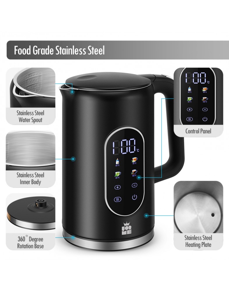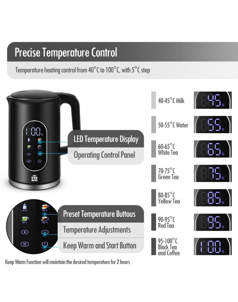 Large digital temperature screen display Four buttons for four pre-set temperatures Temperature selection in the range of 40-100°C in 5°C steps Automatic Keep Warm function after boiling Automatic Standby Mode for saving power Shows actual water temperature Concealed SUS304 stainless steel heating element Dual wall SUS304 interior layer with plastic exterior layer Capacity: 1.7L Power supply: 220-240V 50/60Hz Power: 2200W