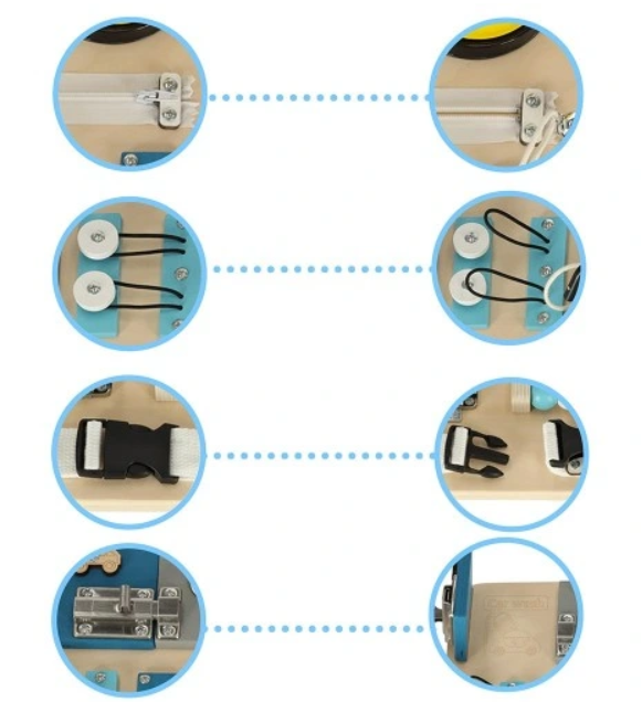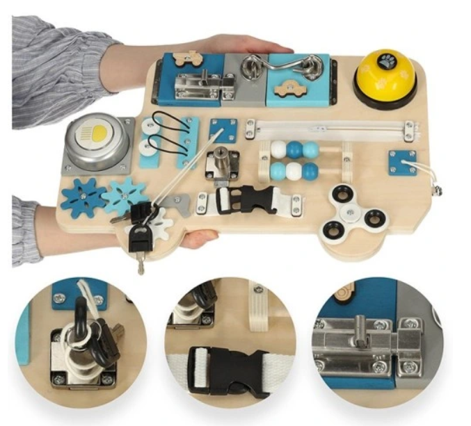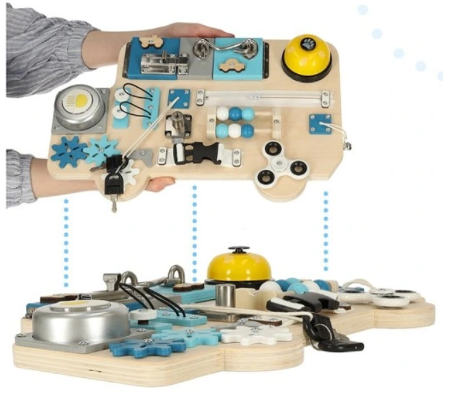 Vaikai smalsūs pasauliui, todėl jie mielai pasiima viską, ką randa. Kaip tėvai, jūs tikriausiai norite, kad jūsų vaikas sužinotų kuo daugiau dalykų, bet ne kiekvienas daiktas yra saugus žaidimui. O kaip viską suderinti? Naudojant manipuliacinę lentą! Bet kas tai yra – manipuliacinė lenta? Tai paprastai medinė lenta su įvairiais elementais (dažniausiai kasdienio naudojimo, pavyzdžiui, užraktas su rakteliais), su kuriais vaikas gali žaisti kaip nori. Ši lenta yra autobuso formos, kuri tikrai patiks kiekvienam transporto priemonių entuziastui. Jutimo elementai taip pat atitinka automobilių pramone – lentoje vaikas ras medinius automobiliukus, taip pat piešinius degalinės ir automobilių plovyklos, paslėptus po spalvotais kvadratais. Žaidžiant su lenta vaikas galės judinti, spausti, sukti ir atidarinėti visus elementus, dėka ko jis nuolat ugdys savo smulkiosios motorikos įgūdžius ir patenkins savo smalsumą. Jutimo lenta taip pat teigiamai paveiks intelektines galias. Stebint ir analizuojant, kaip veikia kiekvienas elementas ir ką reikia padaryti, kad jis pajudėtų, tai bus puikus mokymas loginiam mąstymui, stebėjimo jausmui ir priežasties bei pasekmės sampratai.