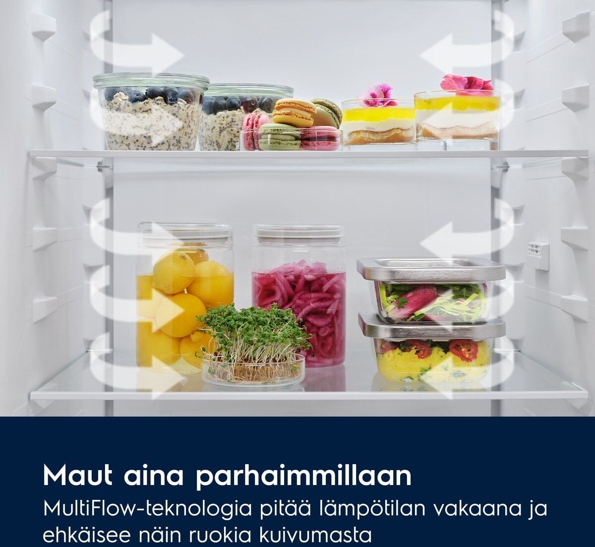 MultiFlow technologija užtikrina, kad šaldytuvo viduje temperatūra išlieka vienoda visur. Kai šaltas oras cirkuliuoja efektyviai, maistas nėra paveiktas temperatūros svyravimais, todėl jis neperdžiūva. Taip jūsų maistas išlieka skanus ir šviežias ilgiau, iki kitos jūsų prekių parduotuvės kelionės.