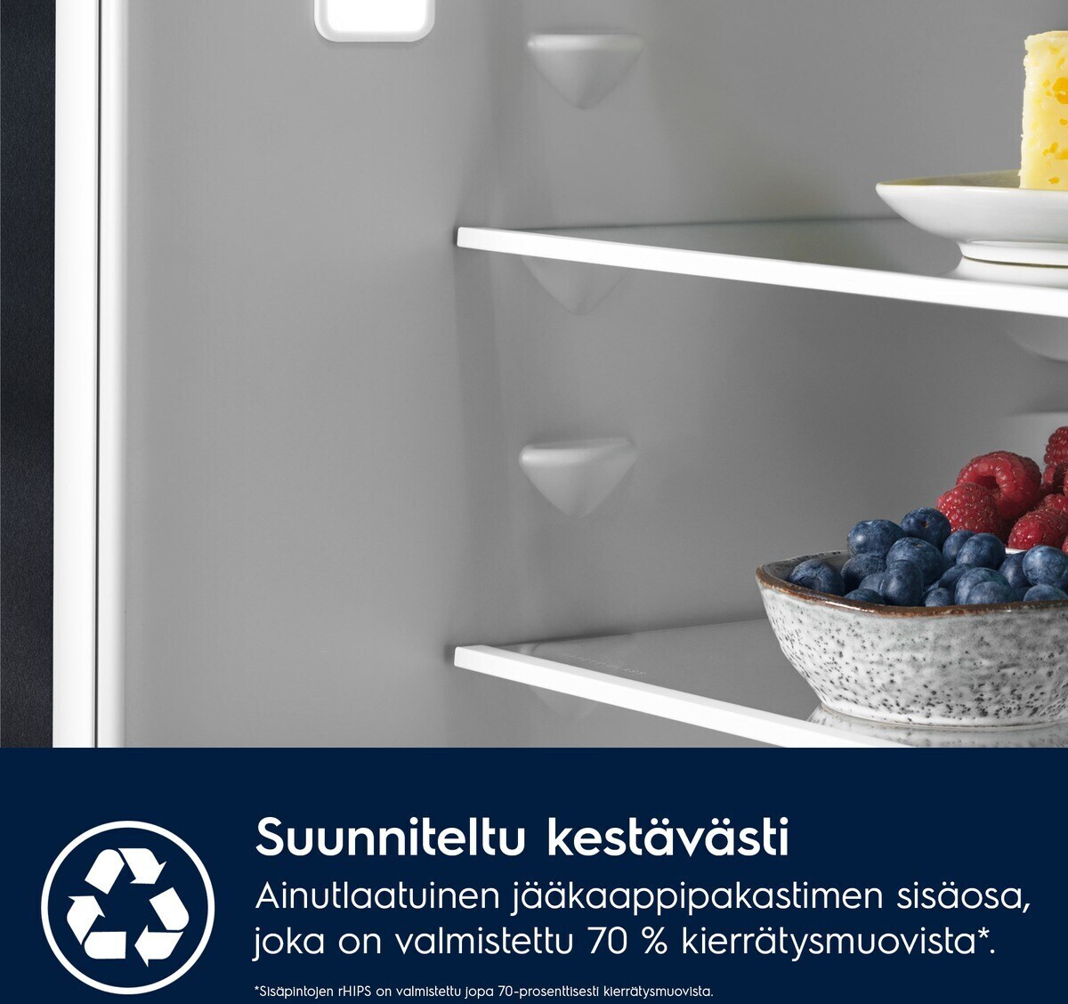 Šis Electrolux 600 TwinTech® No Frost šaldytuvo spintelė yra sukurta, kad maistas išliktų šviežias ir sultingas ilgiau. Inovatyvi dvigubos aušinimo sistema užtikrina optimalų drėgnumo lygį, todėl galite atsisveikinti su išdžiūvusiu maistu. O geriausia tai, kad šaldiklio atšildymas tampa praeitimi! Be to, šis modelis yra žingsnis į tvaresnę ateitį, nes jo vidiniai komponentai pagaminti iš perdirbto plastiko.