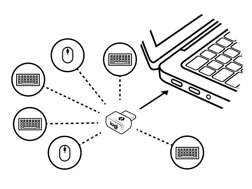 - Prijunkite iki 6 belaidžių Logi Bolt klaviatūrų ir pelės prie kompiuterio su vienu Bolt priimtuvu