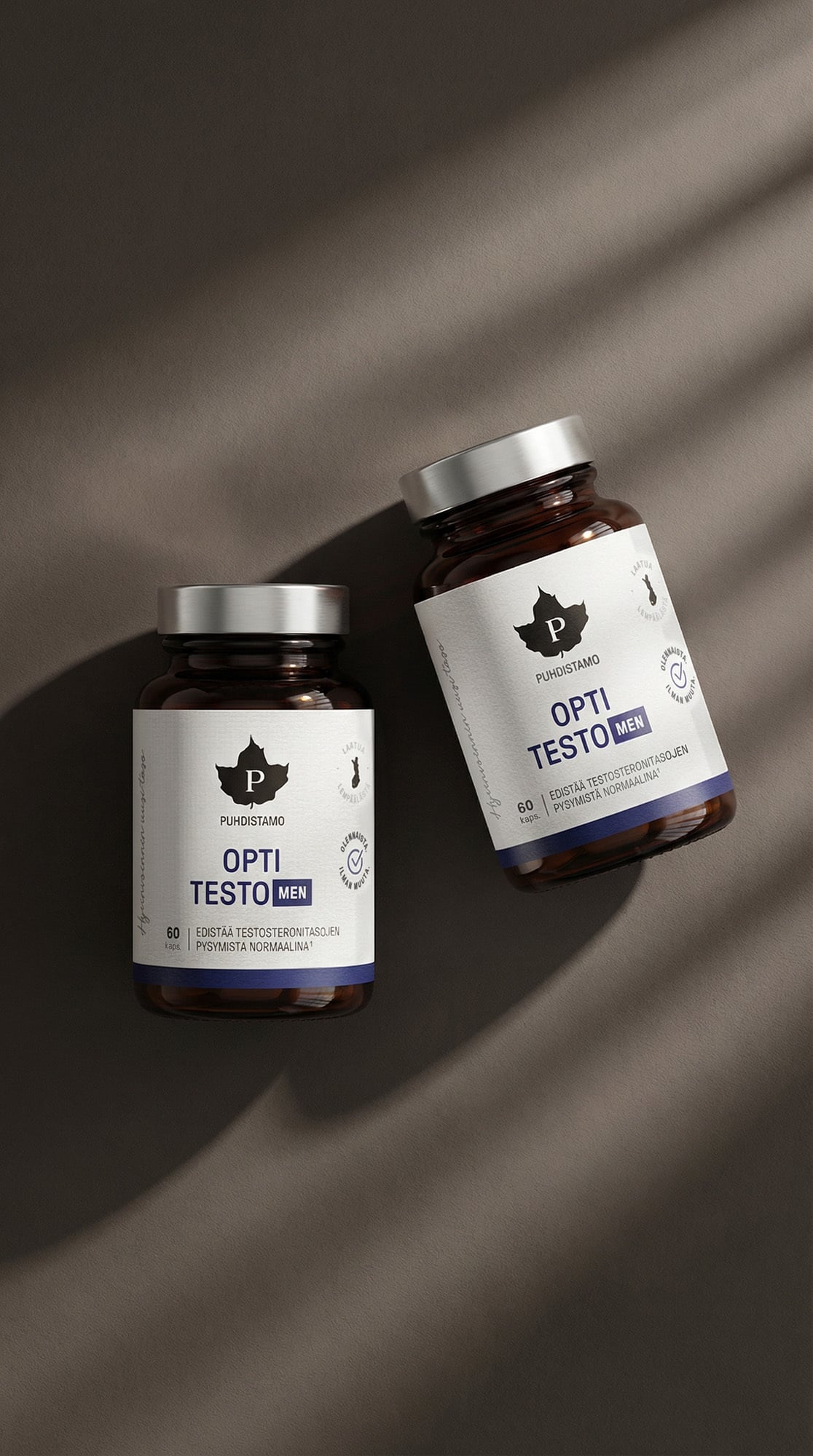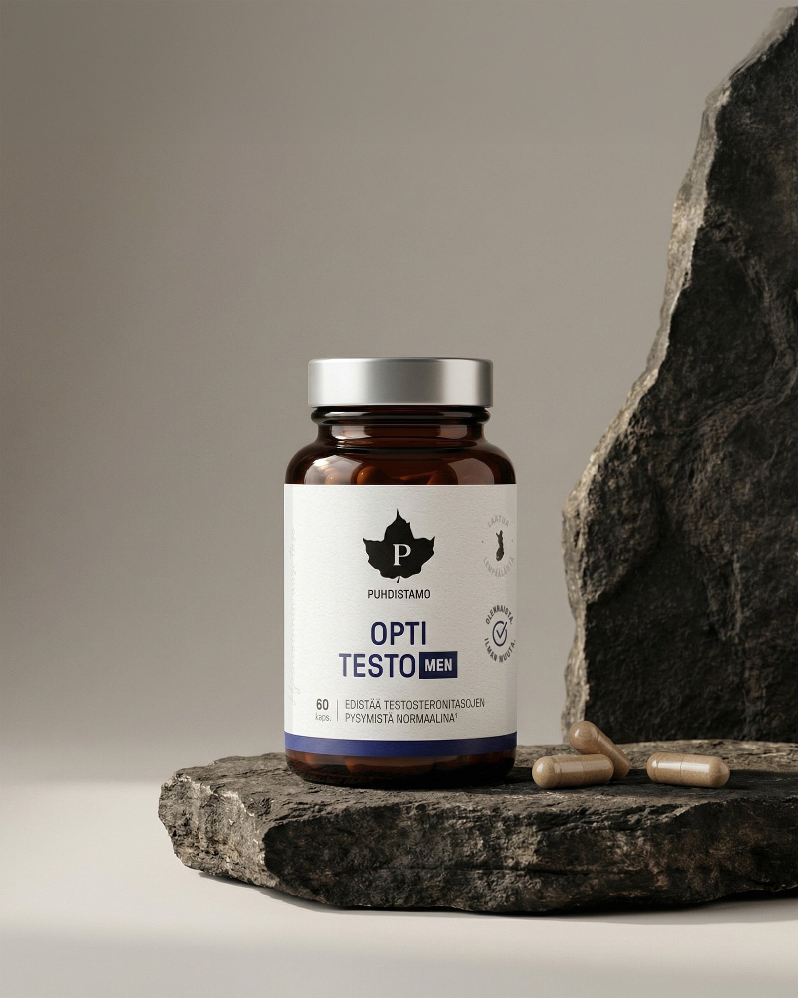 Puhdistamon OptiTesto on miehille tarkoin kehitetty täsmätuote, joka edistää testosteronitasojen pysymistä normaalina. Se sisältää sarviapilan siemenuutetta (TESTOSURGE), muira puaman kuoriuutetta, viinirypäleen siemenuutetta, C-vitamiinia, sinkkiä sekä aktiivista B6-vitamiinia. Sinkki edistää veren testosteronitasojen pysymistä normaalina sekä normaalia hedelmällisyyttä ja lisääntymistä. B6-vitamiini edistää hormonitoiminnan säätelyä. C-vitamiini auttaa vähentämään väsymystä ja uupumusta.