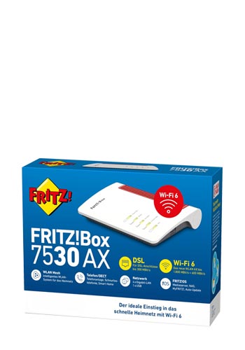 FRITZ!Box 7530 AX ? Schnelles WLAN 6 für Ihr Zuhause Die FRITZ!Box 7530 AX ist ein moderner DSL-Router mit leistungsstarkem Wi-Fi 6 (WLAN AX) und sorgt für stabiles, schnelles Internet in Ihrem Zuhause. Dank Supervectoring bis zu 300 MBit/s ist sie ideal für Streaming, Homeoffice, Online-Gaming und Smart-Home-Anwendungen geeignet. Modernes WLAN 6 mit Mesh-Technologie Mit WLAN 6 profitieren Sie von höheren Datenraten, besserer Reichweite und effizienter Verteilung der Bandbreite ? auch bei vielen gleichzeitig verbundenen Geräten. In Kombination mit weiteren FRITZ!-Produkten ermöglicht die Mesh-WLAN-Funktion eine nahtlose und stabile Abdeckung im gesamten Wohnbereich. FRITZ!OS ? Sicher, einfach und flexibel Mit dem bewährten FRITZ!OS profitieren Sie von einer intuitiven Benutzeroberfläche, regelmäßigen kostenlosen Updates und hohen Sicherheitsstandards. Einrichtung, Netzwerkverwaltung und Kindersicherung sind schnell und unkompliziert umgesetzt. Integrierte Telefonanlage & Smart Home Die FRITZ!Box 7530 AX fungiert als komfortable Telefonanlage mit integrierter DECT-Basis. Sie unterstützt schnurlose Telefone, IP-Telefonie (VoIP), Anrufbeantworter, Faxfunktionen sowie FRITZ! Smart-Home-Geräte ? alles zentral gesteuert. Die ideale Lösung für moderne Haushalte Ob schnelles Internet, starkes WLAN oder zuverlässige Telefonie ? die FRITZ!Box 7530 AX vereint alle wichtigen Funktionen in einem kompakten, energieeffizienten Gerät und ist die perfekte Wahl für zukunftssichere Heimnetzwerke. Farbe Rot/Weiß